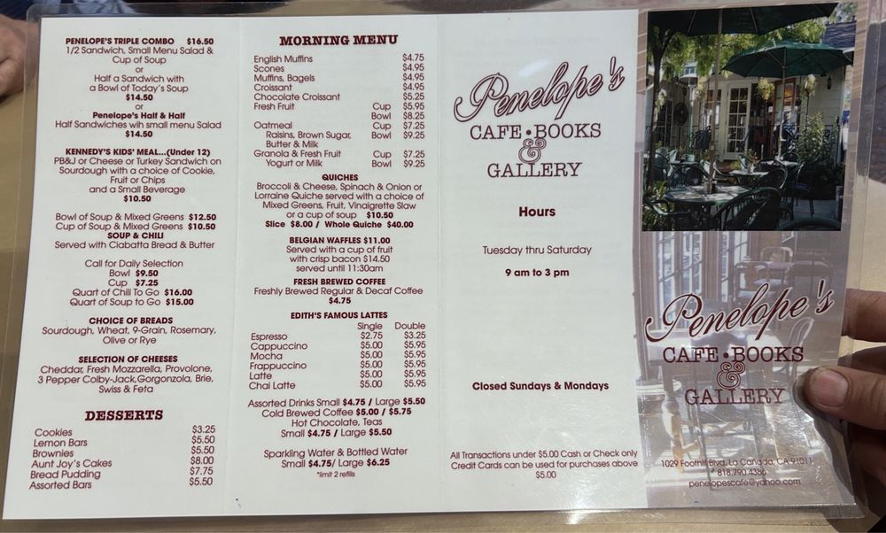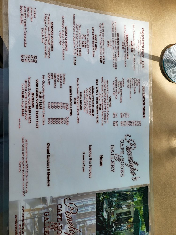 Welcome to Penelope's Cafe Books & Gallery, a charming enclave located at 1029 Foothill Blvd, La Cañada Flintridge. This delightful cafe is renowned for its eclectic menu featuring delicious sandwiches and refreshing salads, complemented by Edith's famous lattes, ranging from creamy cappuccinos to soothing chai lattes. Patrons rave about the vegetarian sandwich, highlighting its flavor and quality.